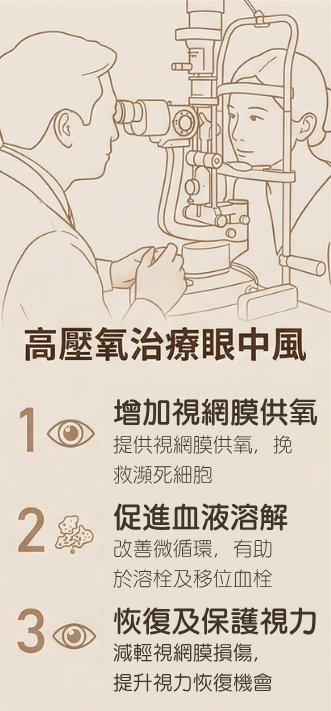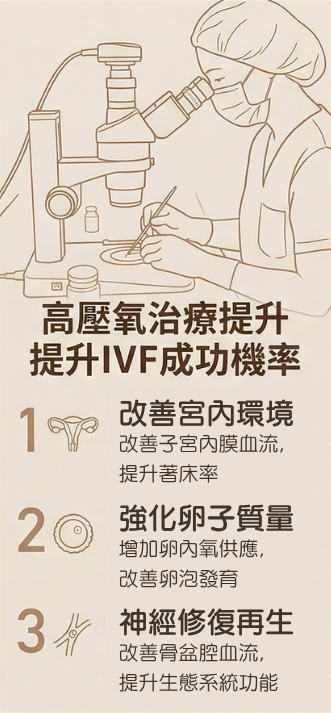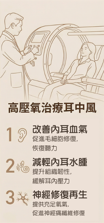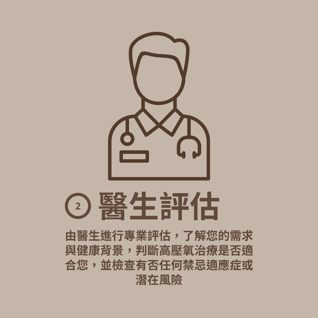 高壓氧治療 (Hyperbaric Oxygen Therapy, HbOT),身處高壓環境下,呼吸接近純氧氣的輔助醫療程序。置身於高壓氧艙後,艙內逐漸加壓並維持在1.4至3個絕對大氣壓 (ATA) 下,同時吸入高濃度氧氣,整個過程的氧氣呼吸量是平常空氣中氧氣的8至15倍。高壓氧治療程序,已獲美國FDA批核,以對應治療指定適應症,全球醫學實證,有效強化血液攜氧能力,加速復元、修復能力。
